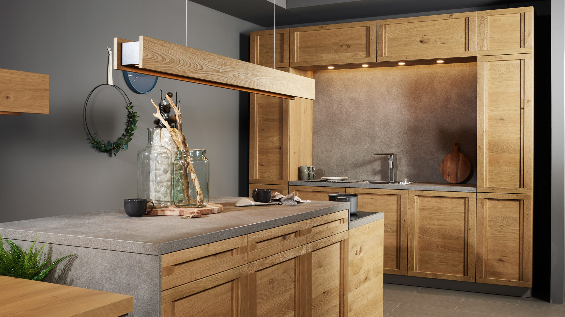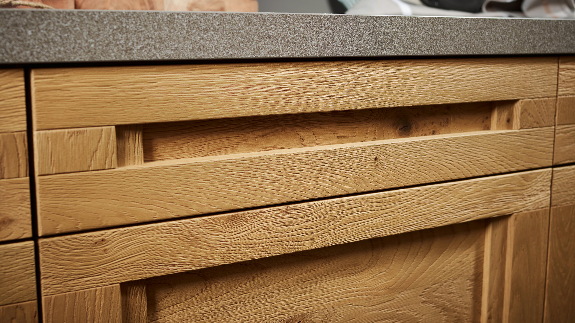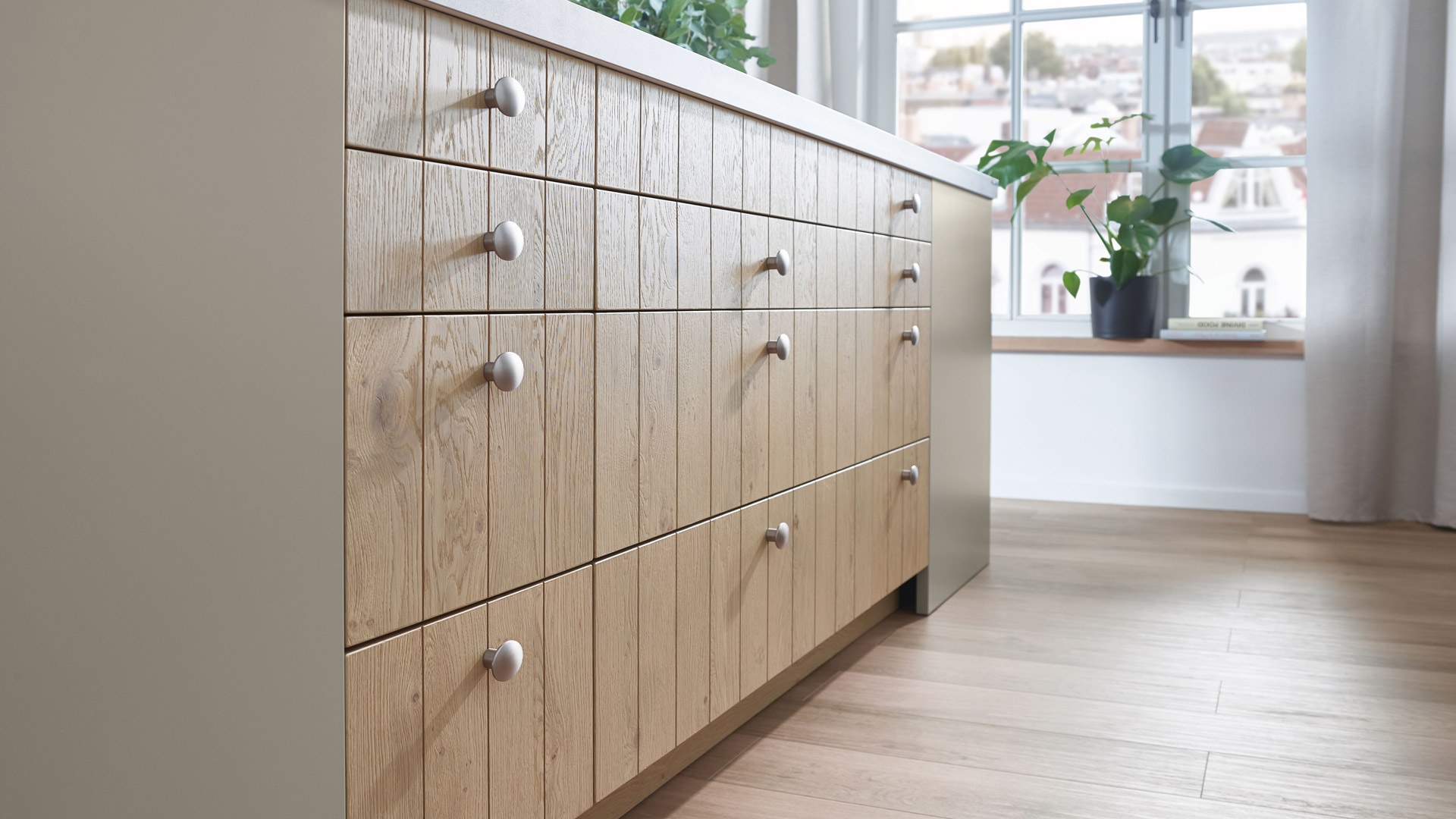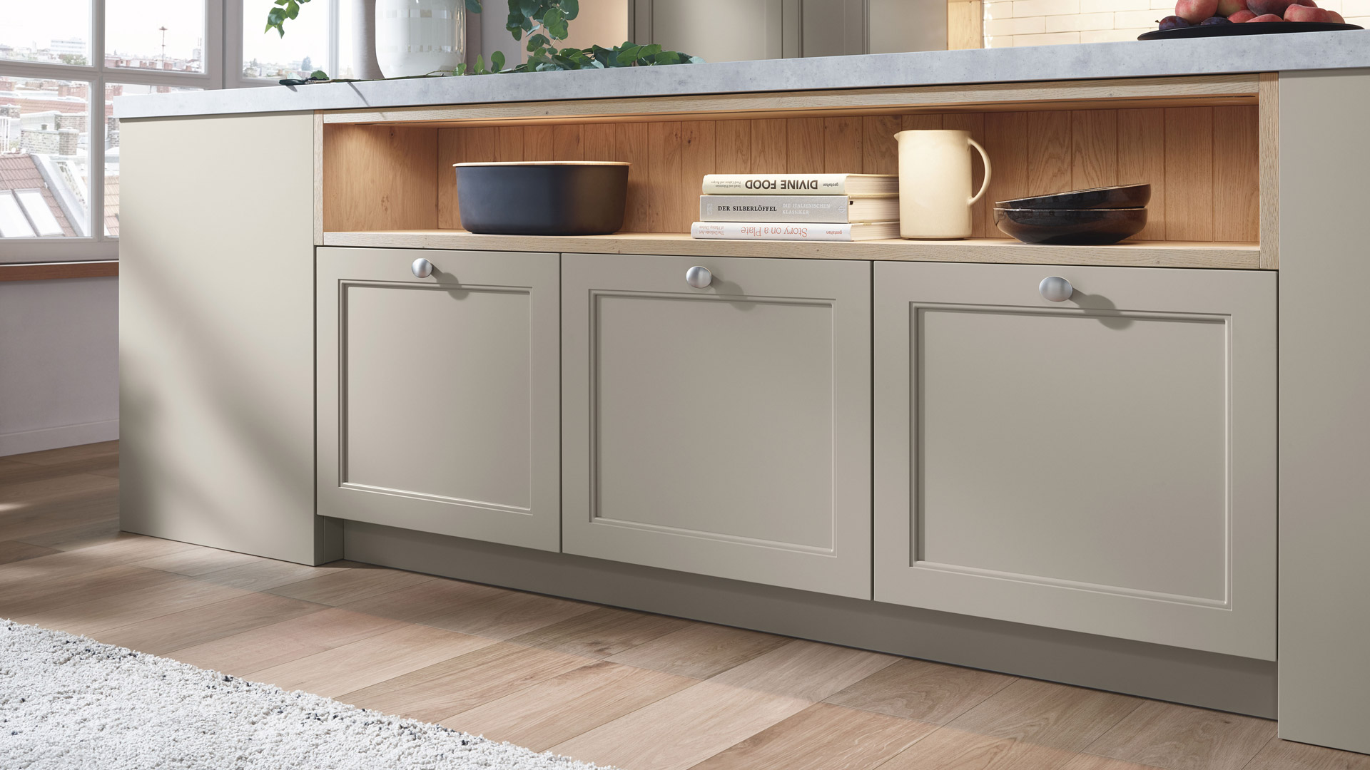 Fronts: premium matlak steengrijs / knoestig eiken, kleur gelijk an K133.